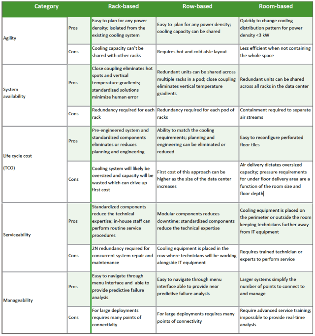 To make effective decisions regarding the choice between room, row, or rack-based cooling for new data centers or upgrades, it is essential to relate the performance characteristics of the cooling methods to practical issues that affect the design and operation of real data centers. So let us compare these cooling methods against various criterias commonly identified by data center users such as;